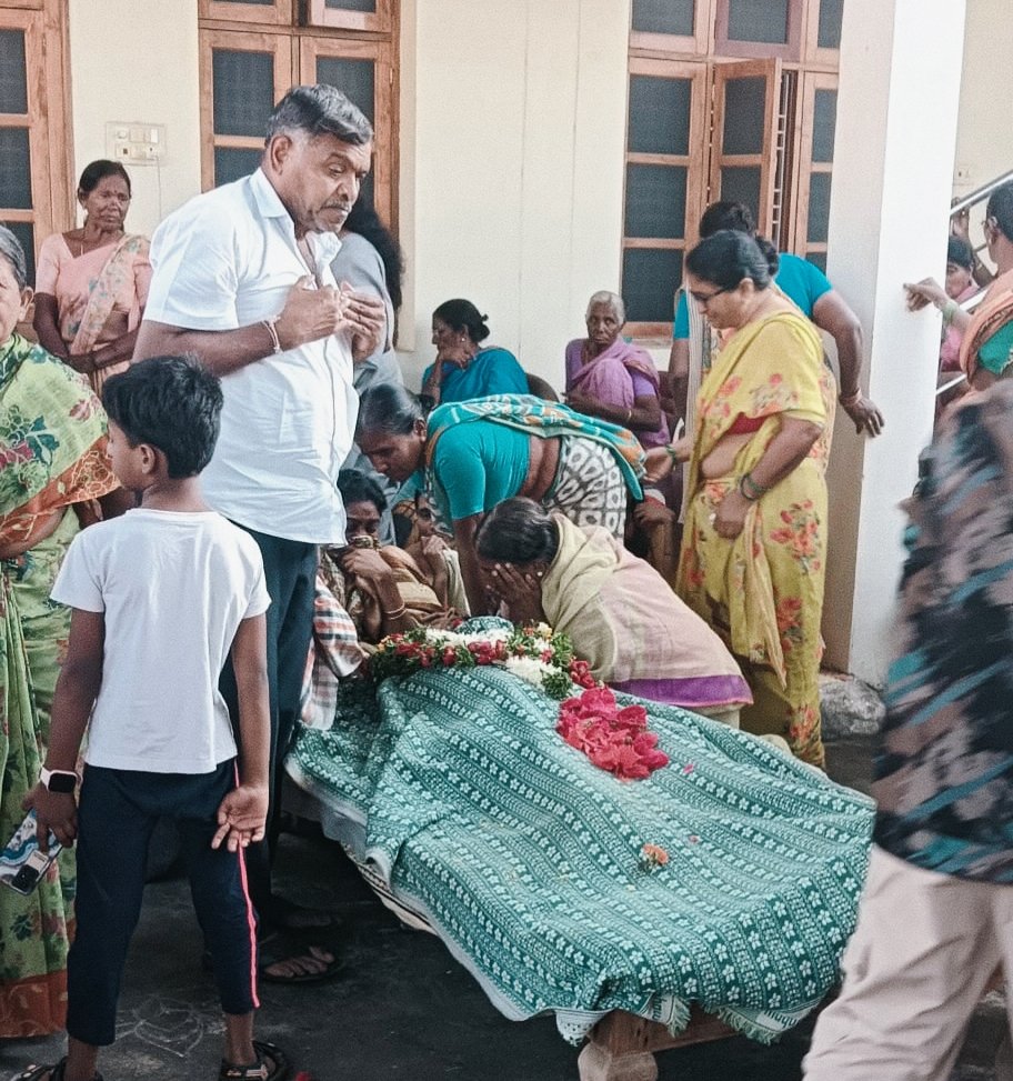 మృతుడు గోపూ రాజిరెడ్డి మృతదేహంపై పూలమాల వేసి నివాళులర్పిస్తున్న పోలాడి రామారావు..
