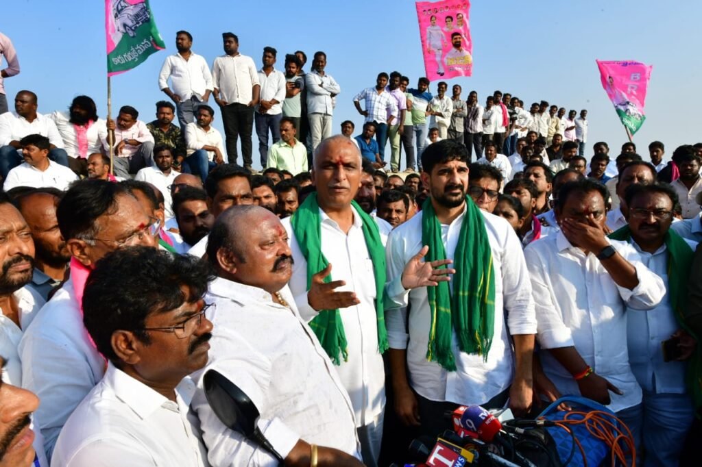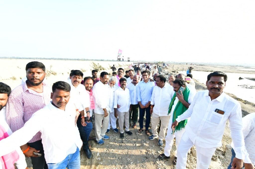 తనుగుల గ్రామ శివారులోని మానేరు నదిపైన ఇటీవల కూలిపోయిన చెక్ డ్యాంను పరిశీలిస్తున్న మాజీ మంత్రులు హరీష్ రావు, గంగుల కమలాకర్, బిఆర్ఎస్ ఎమ్మెల్యేలు, మాజీ ఎమ్మెల్సీలు.. పలువురు ప్రజా ప్రతినిధులు బిఆర్ఎస్ నాయకులు