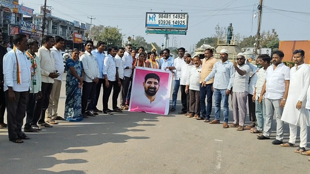 ఎమ్మెల్యే కౌశిక్ రెడ్డి ఫ్లెక్సీతో చౌరస్తాలో నిరసన వ్యక్తం చేస్తున్న కాంగ్రెస్ శ్రేణులు..