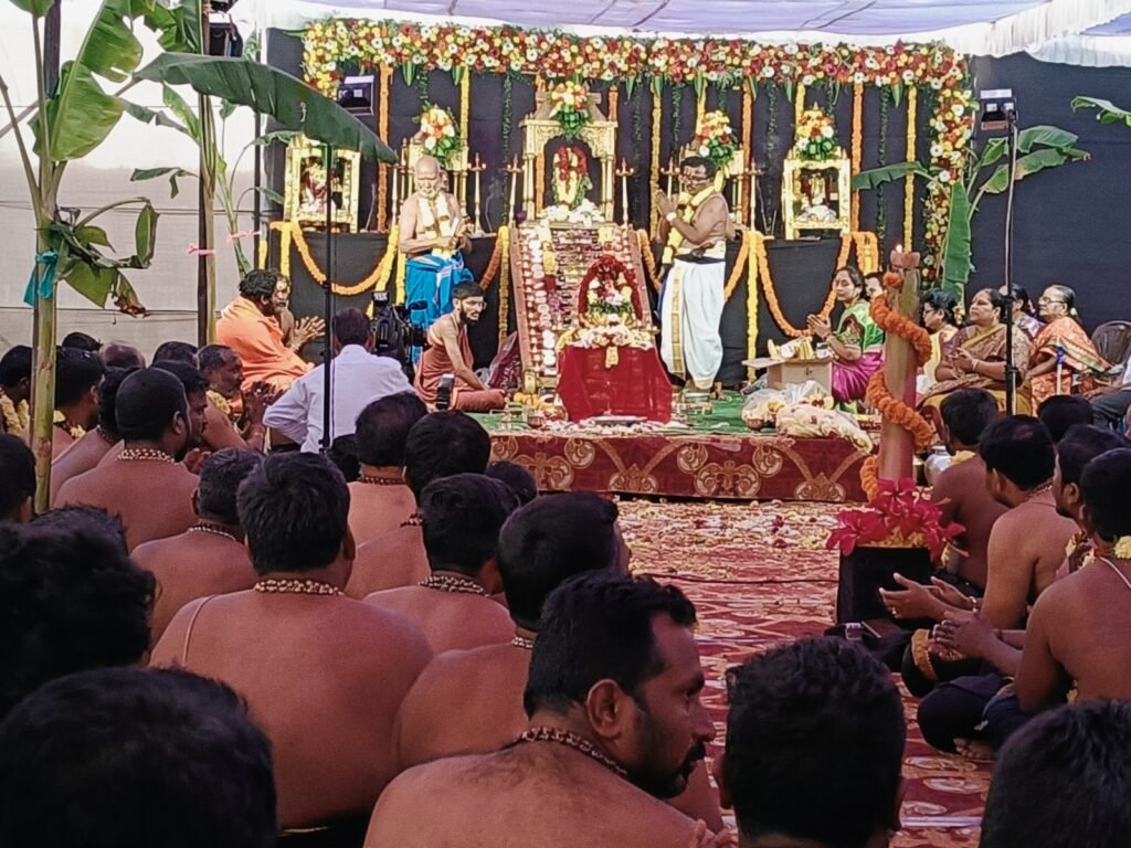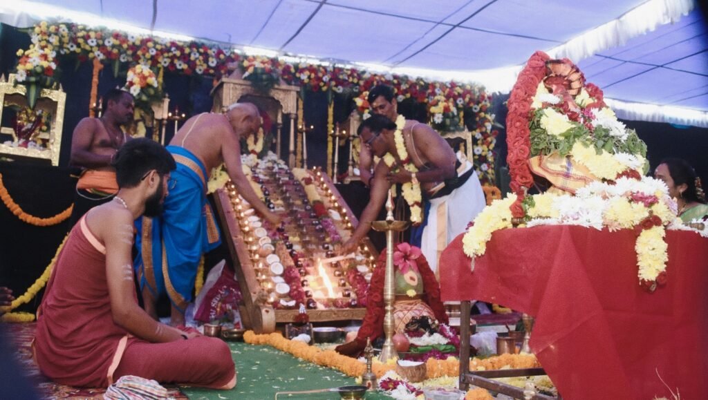 అయ్యప్పస్వామి ఉత్సవ విగ్రహానికి పంచామృతంలతో అభిషేకిస్తున్న సంతోష్ గురుస్వామి..