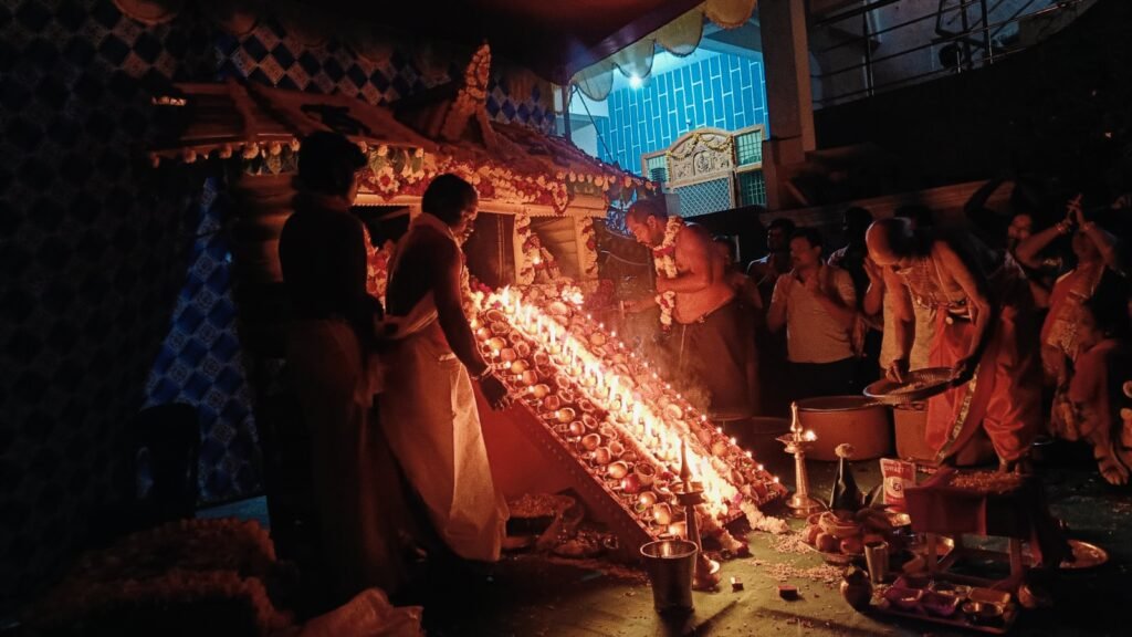 మండల యాదగిరి, స్వర్ణోదయం ప్రతినిధి హుజురాబాద్: హుజురాబాద్ పట్టణంలోని కాకతీయ కాలనీలో పంచకోటి సంతోష్ గురుస్వామి 18వ పడి సందర్భంగా ఈ రోజు రాత్రి ఘనంగా దివ్య మహా పడిపూజ కార్యక్రమం నిర్వహించారు. పుల్లూరి ప్రభాకర్ రావు, కన్నన్ దురైరాజు, కే వెంకట్రావు, ఉపేందర్ గురుస్వాముల ఆధ్వర్యంలో ఈ మహా పడిపూజ కార్యక్రమం కన్నుల పండువగా నిర్వహించారు. అయ్యప్పస్వాముల శరణు ఘోషతో ఆ ప్రాంతమంతా మాతుమ్రోగింది. కన్య స్వాములు అయ్యప్ప స్వామిని పేటతుళ్ళితో స్వామి శరణం అయ్యప్ప… శరణం శరణం అయ్యప్ప అంటూ పేట తుళ్లి ఆడి పాడారు. వేద పండితుల మంత్రోచ్ఛారణల మధ్య పదునేట్టంబడినీ సంతోష్ గురుస్వామి వెలిగించారు. వెంటనే స్వాముల శరణు ఘోషతో ఆ ప్రాంతమంతా మారుతుంది. రంగ రంగ వైభవంగా దివ్య మహా పడిపూజ కార్యక్రమాన్నికి అయ్యప్ప భక్తులు నాన్ అయ్యప్పలు హాజరుకాగ తీర్థ ప్రసాదాలు అందజేయడంతో పాటు అల్పాహారం అందజేసారు.