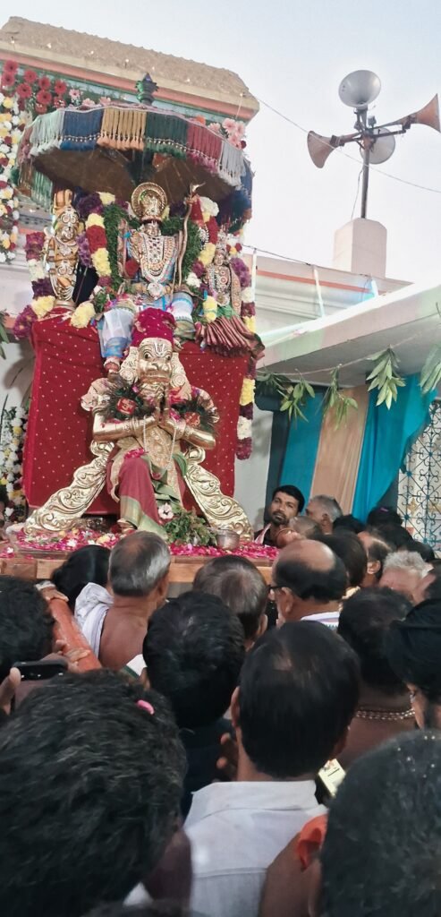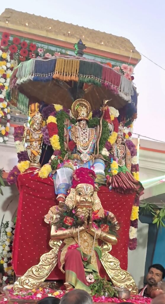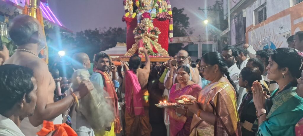 స్వామివారి ఉత్సవ విగ్రహాలను అందంగా ఆలంకరింపజేసిన పల్లకిపై దేవాలయం చుట్టూ భక్తులు తమ భుజాలపై మోస్తున్న భక్తులు..