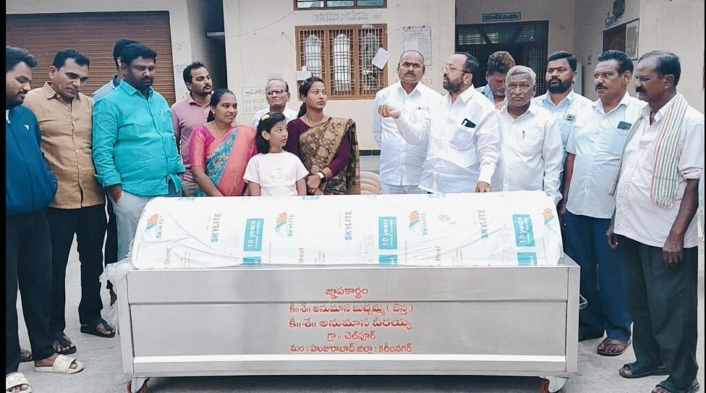 గ్రామ సర్పంచ్, పాలకవర్గ సభ్యులు, గ్రామ పెద్దల సమక్షంలో డెడ్ బాడీ ఫ్రీజర్ అందజేస్తున్న సీనియర్ పాత్రికేయుడు అనుమాస రాజేందర్..