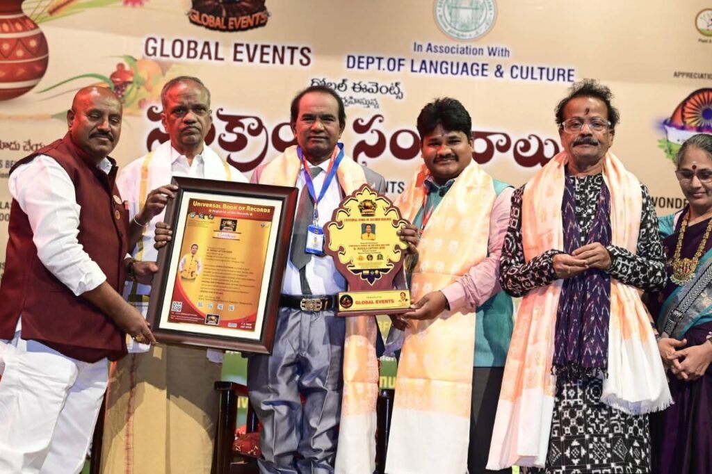 సత్యంగౌడ్ కు పట్టు శాలువా కప్పి, మెడల్ ధరింపజేసి, బొకేను అందజేసి, సన్మాన పత్రంతో పాటు యూనివర్సల్ బుక్ ఆఫ్ రికార్డ్ అవార్డు ప్రధానం చేసి ఘనంగా సన్మానిస్తున్న అతిథులు…