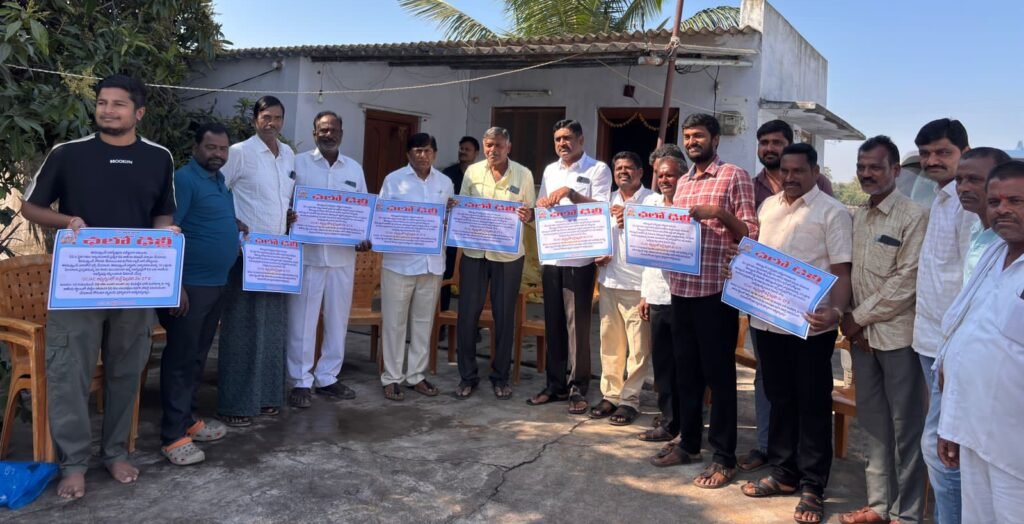 ధర్నా పోస్టర్ లను ఆవిష్కరిస్తున్న వన్నారం గ్రామానికి విచ్చేసిన మాజీ ఎంపీ, ప్రణాళికా సంఘం రాష్ట్ర ఉపాధ్యక్షుడు బోయినపల్లి వినోద్ కుమార్, జిల్లా బీఆర్ఎస్ అధ్యక్షుడు జీ వీ రామకృష్ణారావులు