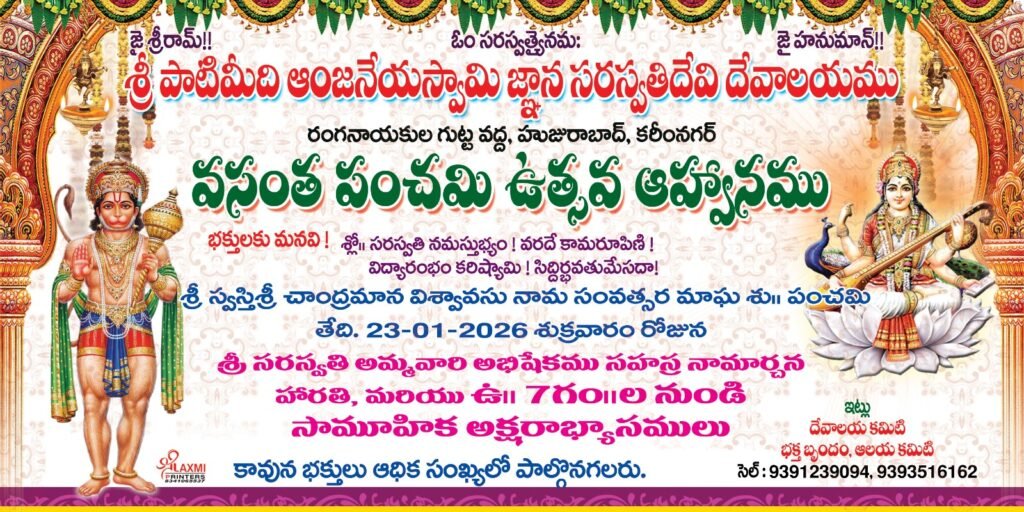 మండల యాదగిరి, స్వర్ణోదయం ప్రతినిధి హుజురాబాద్: కరీంనగర్ జిల్లా హుజురాబాద్ పట్టణ శివారులోని రంగనాయకులగుట్ట వద్దగల పాటిమీద శ్రీ ఆంజనేయస్వామి సరస్వతి సహిత దేవాలయంలో ఈనెల 23వ తేదీ శుక్రవారం వసంత పంచమి వేడుకలు నిర్వహిస్తున్నట్లు దేవస్థాన కమిటీ చైర్మన్ గందే శ్రీనివాస్, అర్చకులు తిరునగరి తిరుమలేష్ లు గురువారం ఒక ప్రకటనలో తెలిపారు. మాఘ శుక్ల పంచమి రోజున సరస్వతి మాత జన్మదిన o సందర్భంగా వసంత పంచమి వేడుకలను ఆలయంలో నిర్వహిస్తున్నట్లు వారు తెలిపారు. ఈ సందర్భంగా ఆలయంలో సహస్రనామార్చన, హారతి కార్యక్రమాలతో పాటు సామూహిక అక్షరాభ్యాస కార్యక్రమం ఘనంగా నిర్వహించడం జరుగుతుందని భక్తులు హాజరై అమ్మవారి కృపకు పాత్రులు కాగలరని వారు కోరారు.