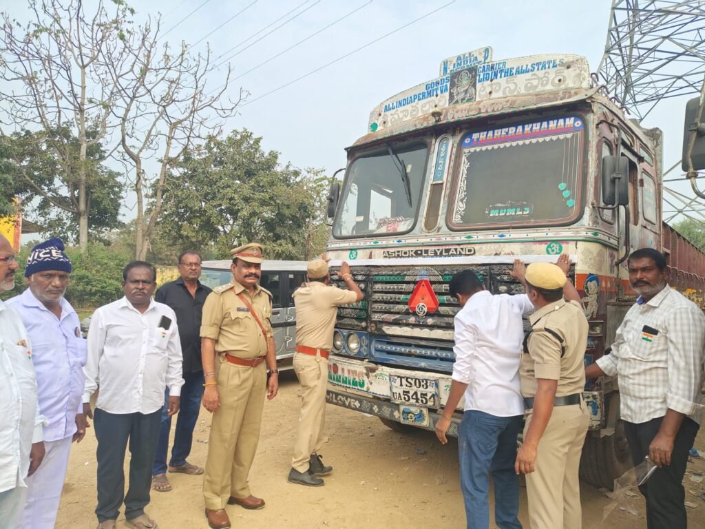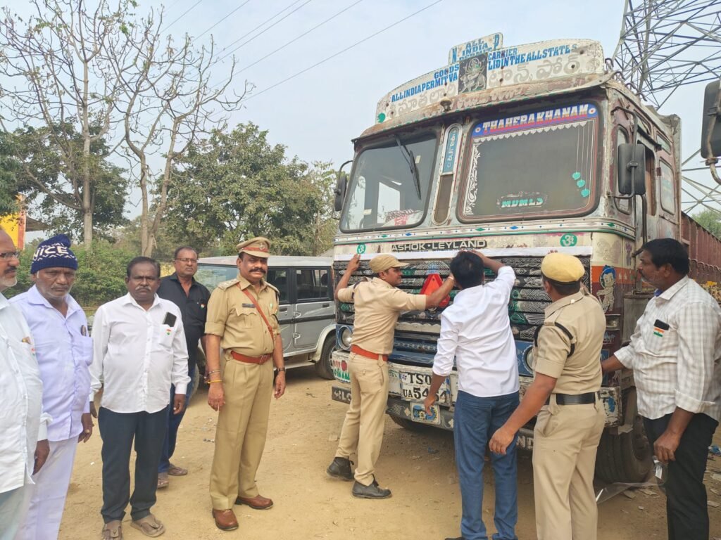 లారీలకు రిఫ్లెక్టివ్ స్టిక్కర్లాంటిస్తున్న రవాణా శాఖ సిబ్బంది.. పర్యవేక్షిస్తున్న ఎంవీఐ.