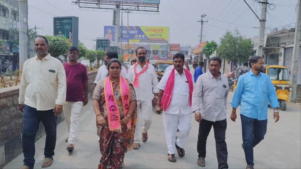 నామినేషన్ దాఖలుకు తన తండ్రి శ్రీనివాస్, వార్డు ఓటర్లతో కలిసి వెళ్తున్న బండ సింధుజ..