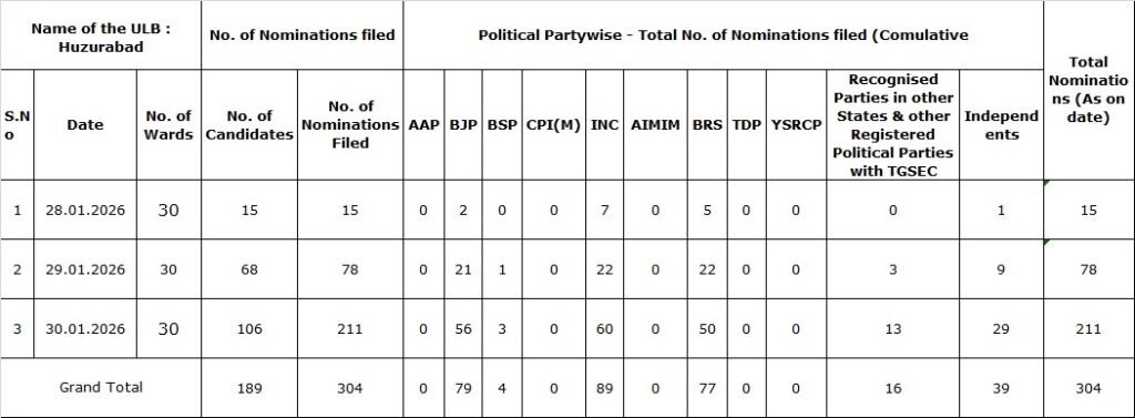 మండల యాదగిరి, స్వర్ణోదయం ప్రతినిధి హుజురాబాద్: కరీంనగర్ జిల్లా హుజురాబాద్ మునిసిపాలిటీకి జరుగుతున్న రెండవ సాధారణ ఎన్నికల్లో పోటీ చేసేందుకు మొత్తం 304 నామినేషన్లు దాఖలైనట్లు హుజురాబాద్ మునిసిపల్ కమిషనర్ సయ్యద్ ముసబ్ అహ్మద్ తెలిపారు. నామినేషన్ల మొదటి రోజున 15 నామినేషన్లు, రెండవ రోజున 78 నామినేషన్లు, చివరి రోజున 211 నామినేషన్లు దాఖలయ్యాయని ఆయన చెప్పారు. మొత్తం 189 మంది నామినేషన్లు వేశారని అందులో బిజెపి 79 మంది, బిఎస్పీ నుండి నలుగురు, కాంగ్రెస్ 89, బిఆర్ఎస్ నుండి 77, స్వతంత్ర అభ్యర్థులు 39 మంది, ఇతర రాజకీయ పార్టీల నుండి 16 మంది అభ్యర్థులు నామినేషన్లు వేశారన్నారు.