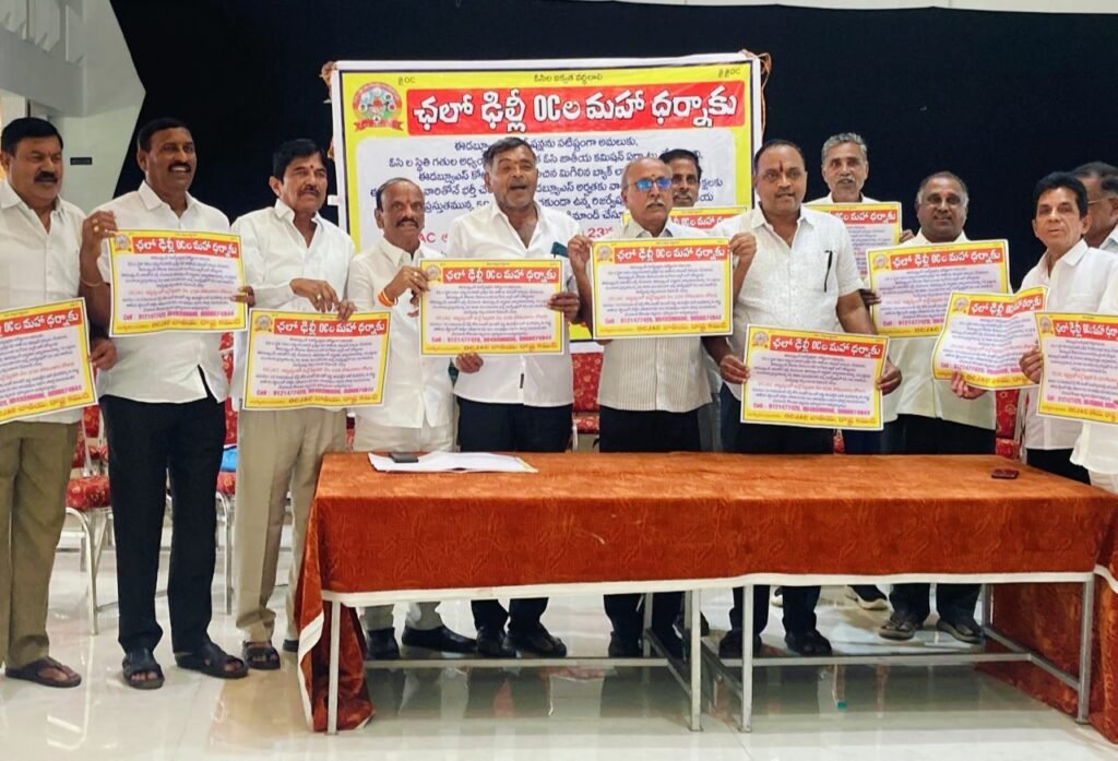 చలో ఢిల్లీ వాల్ పోస్టర్లను ఆవిష్కరిస్తున్న ఓసి జేఏసీ జాతీయ అధ్యక్షుడు పోలాడి రామారావు, ఇతర నాయకులు..