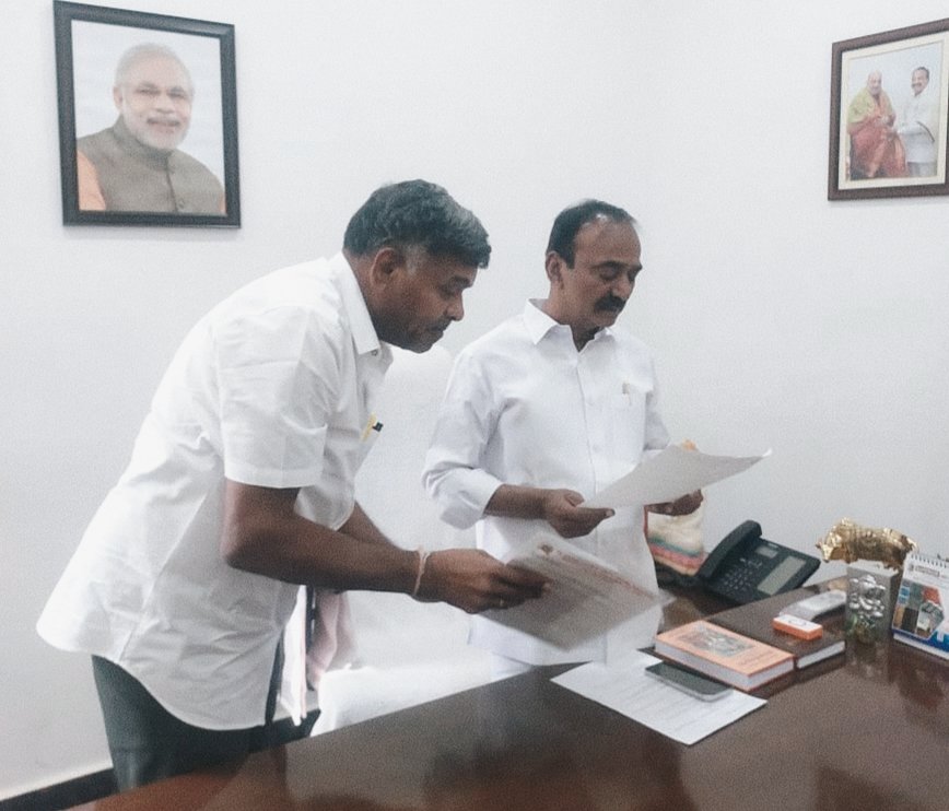ఢిల్లీలో మహాధర్నాకు హాజరుకావాలని ఆహ్వాన పత్రాన్ని ఎంపీ ఈటెల రాజేందర్ కు అందజేస్తున్న ఓసీ సంఘాల సమాఖ్య జాతీయ అధ్యక్షుడు పోలాడి రామారావు..