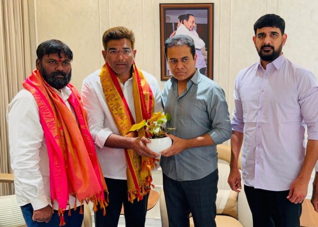 బిఆర్ఎస్ పార్టీ వర్కింగ్ ప్రెసిడెంట్ కేటీఆర్ ముంతాజ్ అలీ, మొహమ్మద్ (జావేద్) కు పూల మొక్క ఇచ్చి అభినందనలు తెలుపుతున్న కేటీఆర్, కౌశిక్ రెడ్డి..