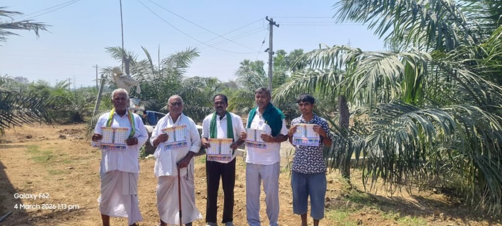 హన్మకొండ జిల్లా పెంచికలపేట శివారు ప్రాంతమైన గూడూరి స్వామిరెడ్డి పెంచుతున్న పామాయిల్ సాగు విధానాన్ని రైతులతో కలిసి పరిశీలించి రైతుమిత్ర నూతన సంవత్సర క్యాలెండర్ ఆవిష్కరణ కార్యక్రమం లో పాల్గొన్న పోలాడి రామారావు.