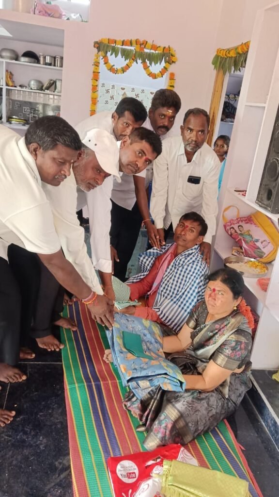 మటికే సుజాత సంపత్ దంపతులకు బట్టలు పెడుతున్న ఇందిరమ్మ ఇళ్ల కమిటీ సభ్యులు..