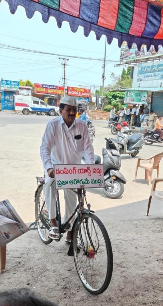 మండల యాదగిరి, స్వర్ణోదయం ప్రతినిధి హుజురాబాద్: ప్రజారోగ్యానికి హాని కలిగించే డంపింగ్ యార్డ్ ఏర్పాటు ను ప్రభుత్వం విరమించుకోవాలని నిరసిస్తూ సామాజిక కార్యకర్త నలుబాల వేణుగోపాల్ వినూత్నంగా సైకిల్ పై తిరుగుతూ ప్రచారం చేస్తూ నిరసన తెలిపారు. హుజురాబాద్ పరిసర ప్రాంతాల్లో ప్రభుత్వం ఏర్పాటు చేయ తలపెట్టిన డంపింగ్ యార్డ్ కు వ్యతిరేకంగా అఖిలపక్ష కమిటీ ఆధ్వర్యంలో గత 12 రోజులుగా నిరసన దీక్షలు వివిధ వర్గాల ప్రజలు నాయకులు చేపడుతుండగా, పట్టణానికి చెందిన సామాజికవేత్త నలుబాల వేణుగోపాల్ సైకిల్ పై ‘డంపింగ్ యార్డ్ వద్దు ప్రజారోగ్యమే ముద్దు ‘అనే ప్లెక్సీ తో పట్టణంలోని వీధులన్నీ తిరుగుతూ ప్రజలకు అవగాహన కల్పిస్తున్నారు. నిరసన దీక్షలు జరిగే ప్రాంతంలో ఉండి ప్రచారం నిర్వహిస్తున్నారు. డంపింగ్ యార్డ్ కు నిరసనగా వినూత్నంగా నిర్వహిస్తున్న ప్రచారాన్ని పలువురు అభినందిస్తున్నారు.