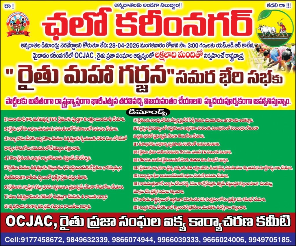 ఆయకట్టు చివరి వరకు నీళ్ళు అందించే విధంగా వాటర్ మేనేజ్ మెంట్ చేయాలని, ఇచ్చిన హామీల మేరకు జాబ్ కేలండర్ ప్రకటించి యువతకు ఉద్యోగావకాశాలు కల్పించాలని, ఆర్ధికంగా వెనుకబడిన ఓసిల సంక్షేమం కోసం ఇతర సామాజిక వర్గాలకు ఉన్నట్లుగా జాతీయ రాష్ట్ర స్థాయిలో ఓసి కమిషన్ ఏర్పాటు చేయాలనే తదితర డిమాండ్ల సాధనకు అన్ని సామాజిక వర్గీయుల సమస్యలు పరిష్కరించాలని డిమాండ్ చేస్తూ ఈ నెల ఏప్రిల్ 28న ఓసి ఐకాస ప్రజా సంఘాల జేఏసీ ఆధ్వర్యంలో పార్టీల కతీతంగా న భూతో న భవిష్యత్ తరహాలో ఈ రాజకీయ పార్టీ నిర్వహించని రీతిలో లక్షలాది మందితో నిర్వహించే రాష్ట్రస్థాయి రైతుల మహాగర్జన సమర భేరి సభకు రాజకీయాల కతీతంగా అన్నీ వర్గాల ప్రజలను తాజా మాజీ ప్రజా ప్రతినిధులను వివిధ పార్టీల నాయకుల ను ఆహ్వానిస్తున్నామని ఇందులొ భాగంగా మాజీ మంత్రులు ఈటల రాజేందర్, గంగుల కమలాకర్, ఇనుగాల పెద్దిరెడ్డి, హరీశ్ రావు, శ్రీనివాస్ గౌడ్, సుద్దాల దేవయ్య, రావుల చంద్రశేఖరరెడ్డి, ఇంద్ర కరణ్ రెడ్డి, .జీవన్ రెడ్డి లతో పాటు జాగృతి అధ్యక్షురాలు కల్వకుంట్ల కవిత, సీపీఐ అగ్రనేత చాడవెంకట్ రెడ్డి, ఎంఎల్ ఏ నాయిని రాజేందర్ రెడ్డి, మాజీ ఎమ్మెల్యే అలిగిరెడ్డి ప్రవీణ్ రెడ్డి, సతీశ్ బాబు, మనోహర్ రెడ్డి తదితరులను ఇప్పట్టి వరకు స్వయంగా కలిసి ఆహ్వానించగా వారు సానుకూలంగా స్పందించి అన్నీ విధాలుగా సహకారం అందించడం మరువలేనిదని రామారావు ఆనందం వ్యక్తం చేశారు. శరవేగంగా ఏర్పాట్లు జరుగుతున్నాయని,1000ట్రాక్టర్లు, రెండు వేల బస్సులో ప్రజలు స్వచ్ఛందంగా తరలి రావడానికి ఏర్పాట్లు జరుగుతున్నాయని వివిధ జిల్లాలకు కో ఆర్డినేటలను నియమించి బాధ్యతలు ప్రచార సామగ్రి అందజేయడం జరిగిందన్నారు.