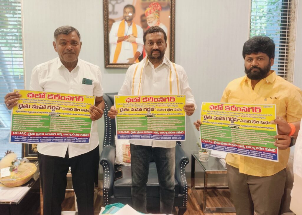 రైతుల న్యాయమైన డిమాండ్లను ఇతర సామాజిక వర్గాల సమస్యల పరిష్కారానికి కేంద్ర రాష్ట్ర ప్రభుత్వాల దృష్టికి తీసుకువెళ్లడమే లక్ష్యంగా ఈనెల 28న ఓసి ఐకాస ప్రజా సంఘాల ఆధ్వర్యంలో కరీంనగర్ లో రెండు లక్షల మందితో రాష్ట్రస్థాయి రైతుల మహాగర్జన సమరభేరి సభను నిర్వహిస్తున్నట్లు పోలాడి రామారావు వెల్లడించారు. సమావేశంలో రైతు ప్రజా సంఘాల జాతీయ ఉపాధ్యక్షుడు నరేందర్ రెడ్డి, రాష్ట్ర అధ్యక్షుడు గూడూరి స్వామిరెడ్డి, ప్రథాన కార్యదర్శి శ్రీహరిరావు, శ్రీనివాస్ తదితరులు ఉన్నారు.