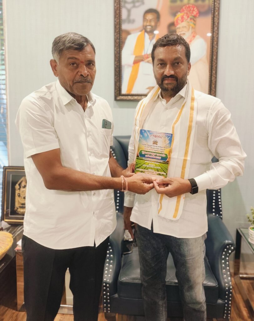 మెదక్ ఎంపీ రఘునందన్ రావుకు రాష్ట్రస్థాయి రైతుల మహాగర్జన సమరభేరి సభ ఆహ్వాన పత్రిక అందజేస్తున్న రామారావు..