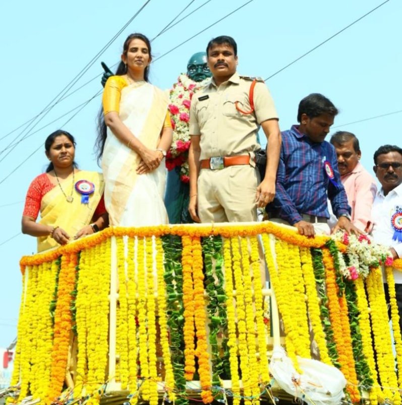 అతిథిగా వచ్చిన ఎసిపి మాధవిని శాలువతో సత్కరించి జ్ఞాపకం చేస్తున్న ఇతర అతిథులు, జయంతోత్సవ నిర్వహణ కమిటీ చైర్మన్ సురేందర్..