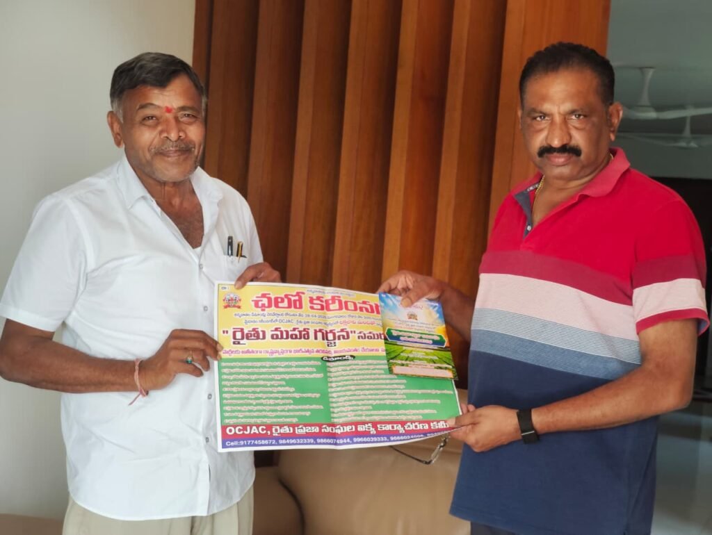 రైతు వ్యతిరేక విధానాలకు నిరసనగా ఇచ్చిన హామీల మేరకు అన్నదాతల న్యాయమైన డిమాండ్లు నెరవేర్చాలని కోరుతూ ఓసి ఐకాస రైతు ప్రజాసంఘాల ఆధ్వర్యంలో కరీంనగర్ లో ఈనెల 28 నరెండు లక్షల మందితో నిర్వహించే రాష్ట్ర స్థాయి రైతుల మహా గర్జన సమర భేరి సభకు హాజరు కావాలని కోరుతూ బీఆర్ఎస్ పార్టీ పోలిట్ బ్యూరో సభ్యులు, రాష్ట్ర ప్రథాన కార్యదర్శి మాజీ ఎంఎల్ సి నారదాసు లక్ష్మణ్ రావును, .మాజీ మేయర్ రవీందర్ సింగ్ ను, మాజీ మేయర్, ప్రస్తుత డిప్యూటీ మేయర్ వై.సునీల్ రావును,