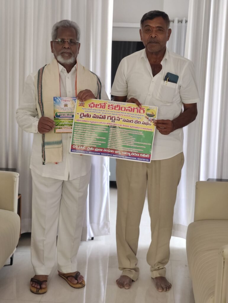 ఈ నెల 28న కరీంనగర్ లో రైతు ప్రజాసంఘాల జేఏసీ ఆధ్వర్యంలో రెండు లక్షల మందితో రాష్ట్రస్థాయి రైతుల మహా గర్జన సమర భేరి సభను పార్టీల కతీతంగా చారిత్రాత్మకంగా నిర్వహిస్తామని పెద్ద ఎత్తున ఉమ్మడి జిల్లా వ్యాప్తంగా కదలి వచ్చి విజయవంతం చేయాలని కోరారు.