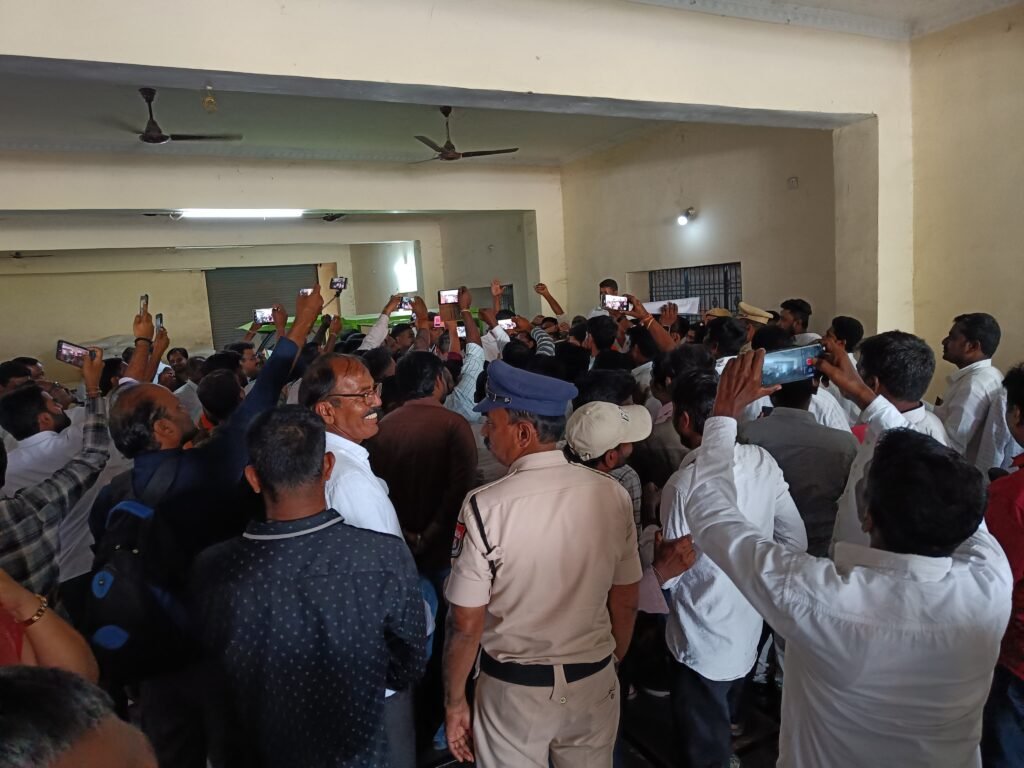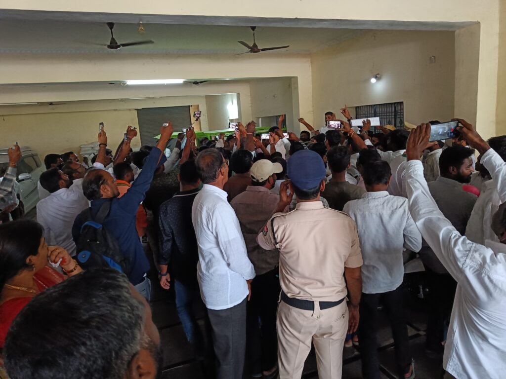 పోటా పోటీగా నినాదాలు చేస్తూ తోసుకుంటున్న ఇరు పార్టీల నాయకులు, కార్యకర్తలు..