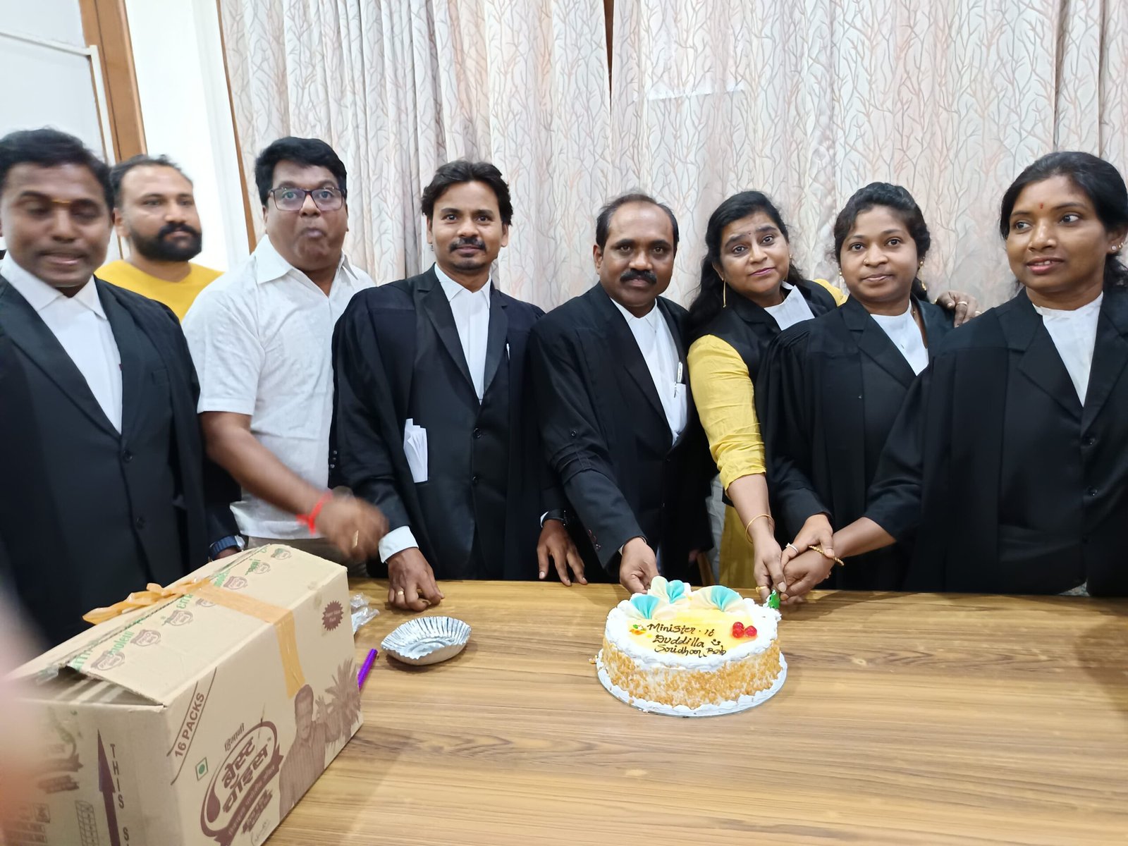 తెలంగాణ రాష్ట్ర ఐటీ,పరిశ్రమల శాఖా మంత్రివర్యులు దుద్ధిల్ల శ్రీధర్ బాబు జన్మదిన వేడుకలు తెలంగాణ హై కోర్ట్ ప్రాంగణంలో అడ్వకెట్స్ ఇనుగాల భీమారావు, బైరి రాకేశ్, దున్న అంబేద్కర్ ల ఆధ్వర్యంలో ఘనంగా జరిగాయి. గవర్నమెంట్ ప్లీడర్ మంగీలాల్, అడ్వకెట్స్ అసోసియేషన్ సెక్రటరీ, జాయింట్ సెక్రటరీ శాంతిభూషణ్, నవీన్ కుమార్ ల సమక్షంలో మంత్రి శ్రీధర్ బాబు బర్త్డే కేక్ ను అడ్వకేట్స్ కట్ చేశారు. అనంతరం అడ్వకేట్ జనరల్ సుదర్శన్ రెడ్డికి, న్యాయవాదులకు, సిబ్బందికి స్వీట్లు పంపిణీ చేశారు. తెలంగాణ అభివృద్ధికి ప్రత్యేకంగా న్యాయవాదుల సంక్షేమం కోసం అనేక చర్యలు చేపట్టిన మంత్రి దుద్ధిల్ల శ్రీధర్ బాబు మరెన్నో జన్మదిన వేడుకలు జరుపుకోవాలని వారు ఆకాంక్షించారు. ఈ కార్యక్రమంలో