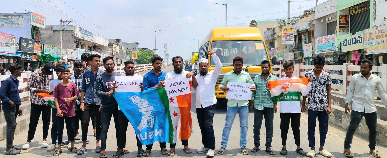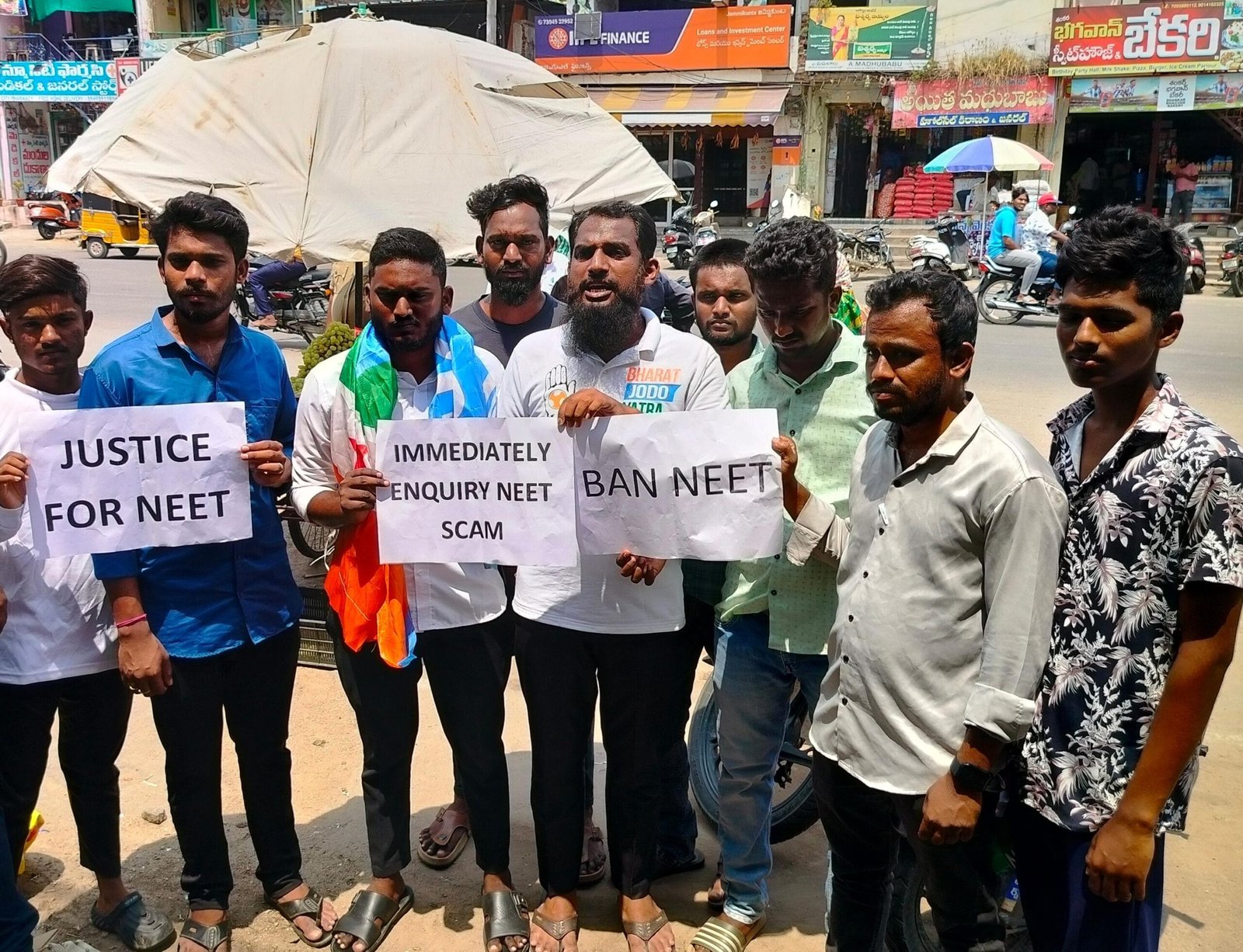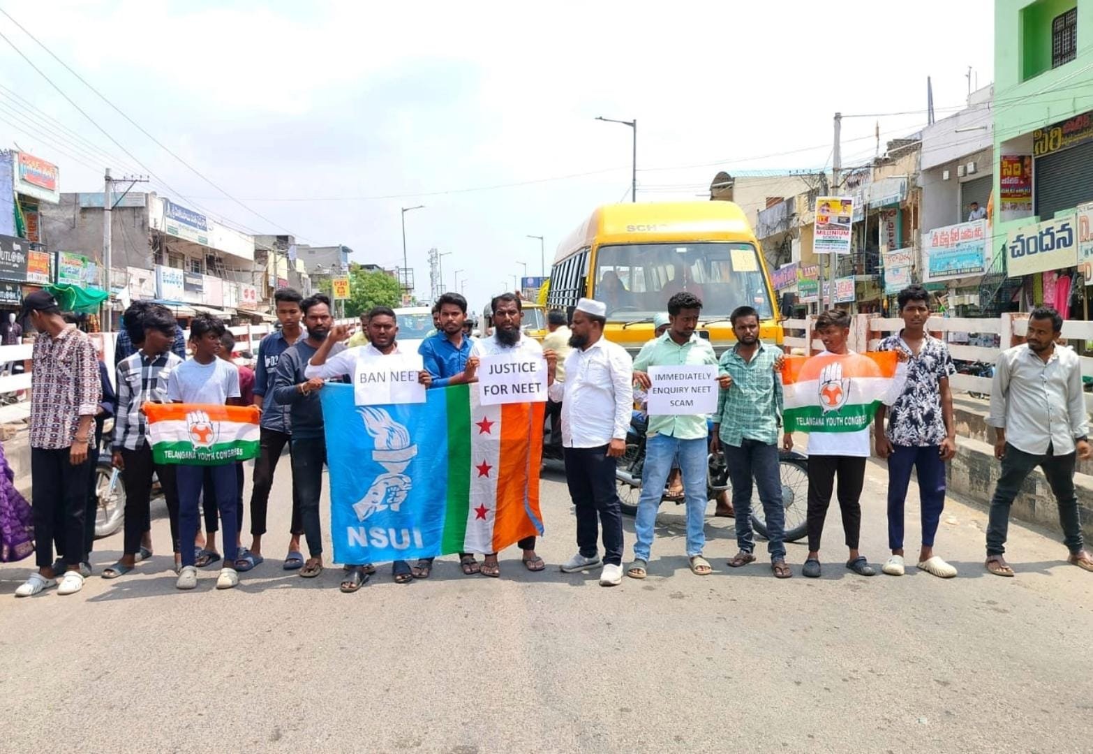 కరీంనగర్ జిల్లా, హుజురాబాద్ నియోజకవర్గంలోని జమ్మికుంట మండల కేంద్రంలో ఎన్ ఎస్ యుఐ మండల అధ్యక్షుడు వాసాల సుధీర్, ఎన్ ఎస్వి కరీంనగర్ జిల్లా ప్రధాన కార్యదర్శి పర్వేజ్ మహమ్మద్ ఆధ్వర్యంలో జమ్మికుంట ఫ్లైఓవర్ బ్రిడ్జి వద్ద గురువారం రాస్తారోకో, ధర్నా నిర్వహించారు. ఈ కార్యక్రమంలో యూత్ కాంగ్రెస్ హుజురాబాద్ నియోజకవర్గ కార్యనిర్వాహక అధ్యక్షులు సజద్ మొహమ్మద్ ముఖ్యఅతిథిగా పాల్గొని ఆయన మాట్లాడుతూ.. 2016లో నీట్ అనే పరీక్షను కేంద్ర ప్రభుత్వం ప్రారంభించిందని, ఇది ఎంబీబీఎస్ చదవడం కోరకై ఎంట్రెన్స్ పరీక్షగా నీట్ ను నిర్వహించారు. అందులో ఎన్ టిఏ అనే సంస్థ నేడు ఈ పరీక్షల ఫలితాల విడుదలలో అవకతవకలు చేస్తూ ఈనెల 14వ తేదీన విడుదల కావలసిన పరీక్ష ఫలితాలను 10 రోజుల ముందుగానే విడుదల చేయడానికి ఇది ముమ్మాటికి స్కామ్ అని తేటతెల్లమైందన్నారు. దీనిపై దేశవ్యాప్తంగా ఎన్ఎస్యుఐ మరియు యూత్ కాంగ్రెస్ శ్రేణులంతా కలిసి భారీ స్థాయిలో పోరాటాలు చేస్తున్న ప్రస్తుత ప్రభుత్వం విద్యార్థుల తల్లిదండ్రులు మరియు విద్యార్థుల జీవితాలను ఎంబిబిఎస్ సీటును వారు బ్యాంకులలో లోన్లు తీసుకొని వారి బంగారాన్ని సైతం కుదపెట్టి వాళ్ళ పిల్లల భవిష్యత్తును బంగారమయం చేయాలనే ఉద్దేశంతో వారు రెండు సంవత్సరాలు అప్పులు చేసి నీట్ కోచింగ్ లకు పంపిన కూడా నేడు ఈ ప్రభుత్వం వారిపై కనీస కనికరం లేకుండా చేస్తుందన్నారు. నీట్ పరీక్షను రద్దు చేయాలని ఆయన డిమాండ్ చేశారు.