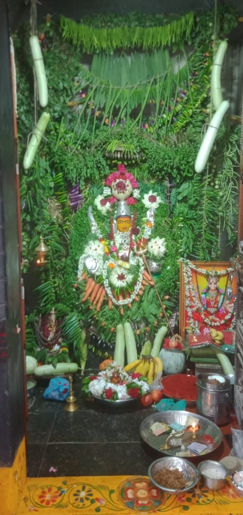 మండల యాదగిరి, స్వర్ణోదయం ప్రతినిధి హుజురాబాద్: హుజురాబాద్ పట్టణంలోని జమ్మికుంట రోడ్డులో గల శ్రీ సంతోషిమాత సహిత అయ్యప్ప స్వామి దేవాలయంలో ఆదివారం వారాహిమాత ప్రత్యేక పూజలు నిర్వహించారు. ఈ సందర్భంగా ఉదయం ఆలయ చైర్మన్ కొత్త అశోక్ రెడ్డి దంపతులు వారాహిమాత పూజలో పాల్గొని ప్రత్యేక పూజలు నిర్వహించారు. సాయంత్రం సంతోషిమాత అమ్మవారిని శాఖంబరి అలంకరణ అలంకరించగా భక్తులు పెద్ద ఎత్తున దర్శించుకుని మొక్కులు చెల్లించుకున్నారు. పలువురు మహిళలు ఎంతో భక్తి శ్రద్ధలతో వివిధ రకాల కూరగాయలతో అమ్మవారిని అలంకరించి శాఖంబరిగా తీర్చిదిద్దారు. భక్తులు పెద్ద ఎత్తున దర్శించుకుని ప్రత్యేక పూజలు చేయగా భక్తులకు ఎలాంటి అసౌకర్యం కలగకుండా ఆలయ నిర్వాహకులు అన్ని ఏర్పాట్లు చేశారు. సంతోషిమాత ఆలయం, అయ్యప్ప స్వామి ఆలయం పూజారులు ప్రత్యేక పూజలు నిర్వహించారు. ఈ కార్యక్రమంలో ఆలయ నిర్వహకులు, భక్తులు, ప్రజలు పాల్గొన్నారు.