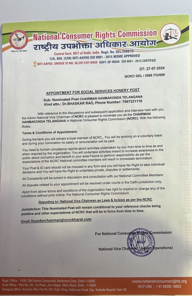 మండల యాదగిరి, స్వర్ణోదయం ప్రతినిధి, హుజురాబాద్: హైదరాబాద్ పట్టణంలోని తెలంగాణ సరస్వతి పరిషత్ వేదికగా నేషనల్ కన్స్యూమర్ రైట్స్ కమిషన్ ఆధ్వర్యంలో ఇంటర్నేషనల్ డెలిగేట్స్ తో గ్రీట్ అండ్ మీట్ తెలంగాణ మరియు ఆంధ్రప్రదేశ్ గ్రేట్ సమ్మిట్, కన్జ్యూమర్ అవేర్నెస్ కార్యక్రమంలో హుజురాబాద్ మండలం రాంపూర్ గ్రామానికి చెందిన డాక్టర్ భాస్కర్ రావు నేషనల్ కన్స్యూమర్ రైట్స్ తెలంగాణ రాష్ట్ర హన్మకొండ చైర్మన్ గా బాధ్యతలు చేపట్టారు. గత కొన్ని సంవత్సరాల నుండి వివిధ రంగాలలో చేస్తున్నటువంటి పలు సామాజిక సేవ కార్యక్రమాలు, ప్రచారాలు మరియు అవగాహన సదస్సులు, కేంద్ర, రాష్ట్ర ప్రభుత్వంల ద్వారా పలు సేవ కార్యక్రమాలు మరియు సేవలందిస్తున్న డాక్టర్ భాస్కర్ రావుకు నేషనల్ కన్స్యూమర్ రైట్స్ కమిషన్ హన్మకొండ జిల్లా చైర్మన్ గా ప్రకటించింది. ఈ కార్యక్రమంలో డాక్టర్ భాస్కర్ రావు మాట్లాడుతూ..వినియోగదారులకు సేవలు అందించాలని ఉద్దేశంతో వినియోగదారులకు చట్టపరంగా ఉన్న హక్కుల పట్ల అవగాహన లేక అనేక మంది నష్టపోతున్నారన్నారు. కాలం మారుతున్నాకొద్ది డిజిటల్ లావాదేవీలు ఆన్లైన్ ట్రాన్సజాక్షన్స్, టెలీమార్కెటింగ్ మరియు ఆన్లైన్ వస్తువులు రకరకాల విక్రయలు ప్రపంచమంతటా జరుగుతుందన్నారు. దీని ద్వారా ఆన్లైన్ మోసాలు, సైబర్ మోసాలు, నాణ్యత లేని వస్తువులు కానీ మరేదైనా కానీ ఇలా అనేక మంది వినియోగదారులకు చట్టపరంగా ఉన్న హక్కుల పట్ల అవగాహన లేక, తెలియకా నష్టపోతున్నారన్నారు. అటువంటి వారి పక్షాన ఉండి పోరాడి న్యాయం చేకూరే విధంగా చూడటమే లక్ష్యమని పేర్కొన్నారు. వినియోగదారుల రక్షణ చట్టం మొట్టమొదటగా భారతదేశంలో 1986 డిసెంబర్ 24న అమల్లోకి వచ్చిందన్నారు. ఆ రోజు నుంచి ప్రతి సంవత్సరం డిసెంబర్ 24న జాతీయ వినియోగదారుల హక్కుల దినోత్సవంగా నిర్వహిస్తున్నామని తెలిపారు. సుమారుగా 35 సంవత్సరాలుగా మారుతున్న కాలానికి ఆనుగుణంగా వాణిజ్య వ్యాపార పద్ధతుల్లో శాస్త్ర సాంకేతికత పెరగడంతో డిజిటల్ లావాదేవీలు, ఆన్లైన్ ట్రాన్సాక్షన్లు, టెలి మార్కెటింగ్ అందుబాటులోకి వచ్చాయన్నారు. దీంతో వినియోగదారుల రక్షణ కోసం కేంద్ర ప్రభుత్వం పాత చట్టం స్థానంలో 2019లో కొత్త రక్షణ చట్టంను తెచ్చిందన్నారు. ఈ నూతన చట్టం 2020 జులై 20 నుంచి భారతదేశం అంతటా అమల్లోకి వచ్చిందన్నారు. ‘వినియోగదారుడా మేలుకో’ అనే నినాదంతో వినియోగదారుల వ్యవహారాలు ఆహారం, ప్రజా పంపిణీ మంత్రిత్వ శాఖ ఆధ్వర్యంలో వినియోగదారుల కోసం, వినియోగదారుల ప్రయోజనం పట్ల పలు కార్యక్రమాలు నిర్వహించిందని గుర్తు చేశారు. ఈ కొత్త చట్టంలో ముఖ్యంగా ఈ- కామర్స్ నిబంధనలు తీసుకురావడంతో అమెజాన్, ఫ్లిప్కార్ట్ వంటి టేలీమార్కెటింగ్ సంస్థలకు కూడా ఇది వర్తించనుందనీ తెలిపారు.ఈ క