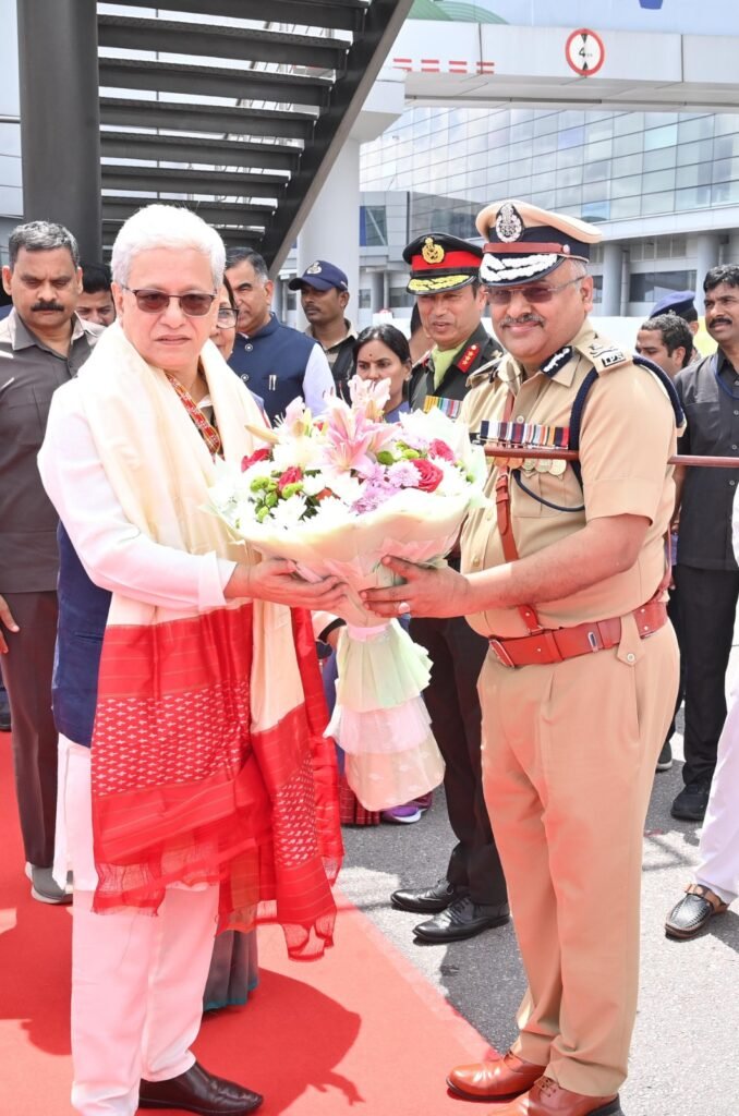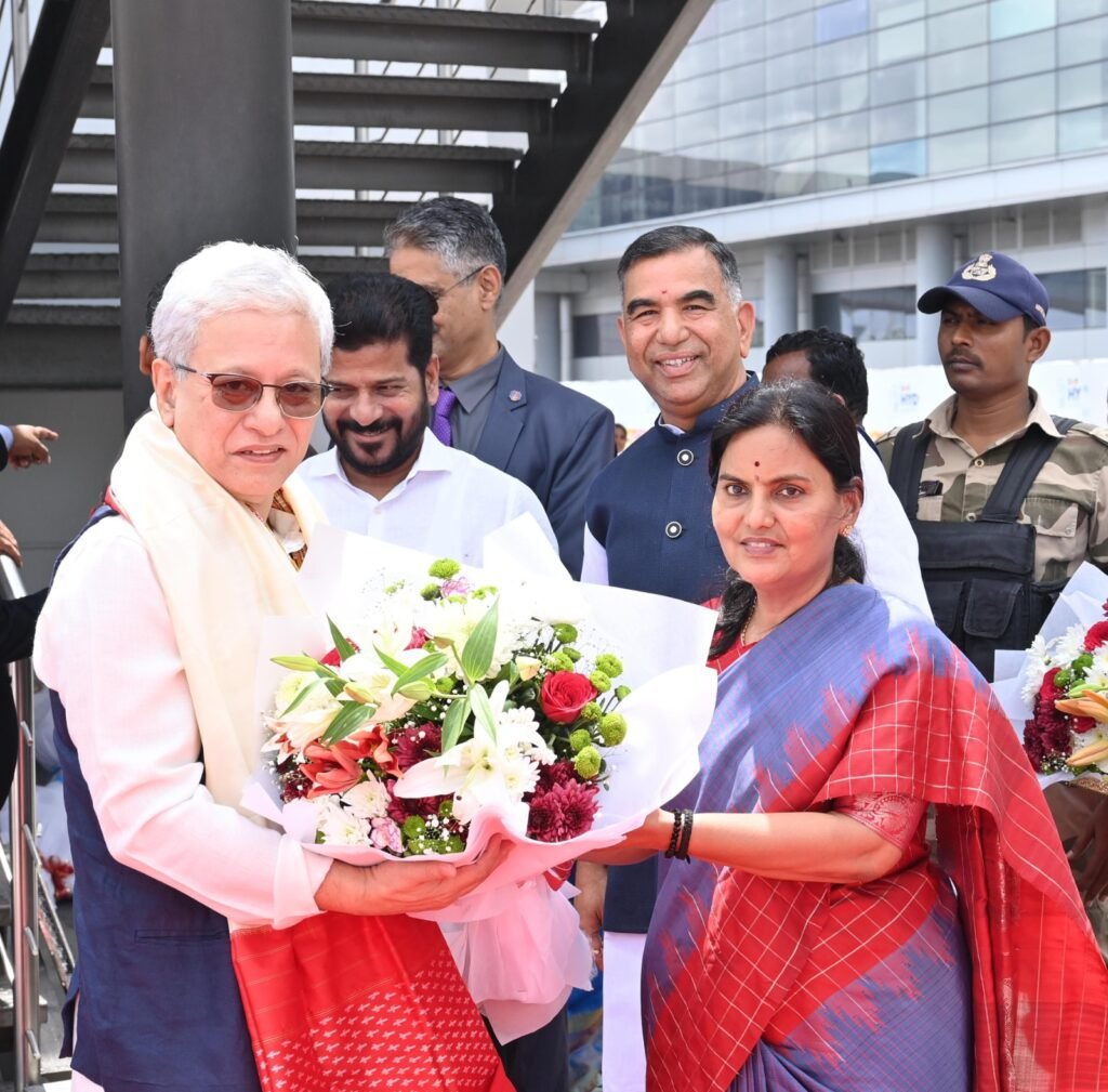 స్వర్ణోదయం ప్రతినిధి, హైదరాబాద్: తెలంగాణ నూతన గవర్నర్ గా నియమితులైన జిష్ణుదేవ్ వర్మకి శంషాబాద్ విమానాశ్రయంలో ముఖ్యమంత్రి రేవంత్ రెడ్డి ఘనంగా స్వాగతం పలికారు. అలాగే సీఎం తోపాటు ప్రభుత్వ ప్రధాన కార్యదర్శి శాంతి కుమారి, డీజీపీ జితేందర్, త్రివిధ దళాల అధికారులు, రాష్ట్ర ప్రభుత్వ సలహాదారు హర్కార వేణుగోపాల్ రావు, ఇతర ఉన్నతాధికారులు కూడా స్వాగతం పలికినవారిలో ఉన్నారు. ఈ సందర్భంగా నూతన గవర్నర్ సాయుధ దళాల గౌరవ వందనం స్వీకరించారు.