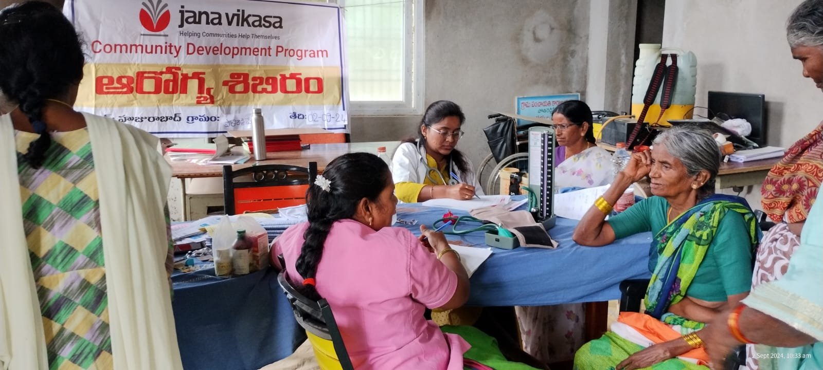 మండల యాదగిరి, స్వర్ణోదయం ప్రతినిధి హుజూరాబాద్ సెప్టెంబర్ 2: హుజురాబాద్ మునిసిపాలిటీ పరిధిలోని పోతిరెడ్డిపేట గ్రామంలో సోమవారం లక్ష్మీనరసింహ హాస్పిటల్ హన్మకొండ వారి సౌజన్యంతో జనవికాస స్వచ్ఛంద సేవ సంస్థ ఆధ్వర్యంలో ఉచిత మెగా వైద్య శిబిరం నిర్వహించడం జరిగింది. ఈ వైద్య శిబిరంలో లక్ష్మీ నరసింహ హాస్పిటల్ స్త్రీల ప్రత్యేక వైద్య నిపుణులు డాక్టర్ రాజేశ్వరి గ్రామంలోని 100 మంది స్త్రీలకు పరీక్షలు నిర్వహించి ఉచితంగా మందులు పంపిణీ చేశారు. ఈ సందర్భంగా జన వికాస సంస్థ హుజురాబాద్ సెంటర్ మేనేజర్ ఎండి ఖాజాభీ మాట్లాడుతూ వర్షాకాలంలో సీజనల్ వ్యాధులు ప్రబలకుండ తగు జాగ్రత్తలు తీసుకోవాలని, పరిసరాల పరిశుభ్రత పాటించాలని తెలిపారు. ఈ కార్యక్రమంలో హుజురాబాద్ జన వికాస సెంటర్ మేనేజర్ ఎండి ఖజాభీ, సూపర్వైజర్ రవీందర్, నర్సులు ఫారా, రాజేశ్వరి మరియు హుజురాబాద్ సెంటర్ కో ఆర్డినేటర్ లీల, రజిత మరియు కారోబార్ లు తదితర మహిళలు పాల్గొన్నారు.
