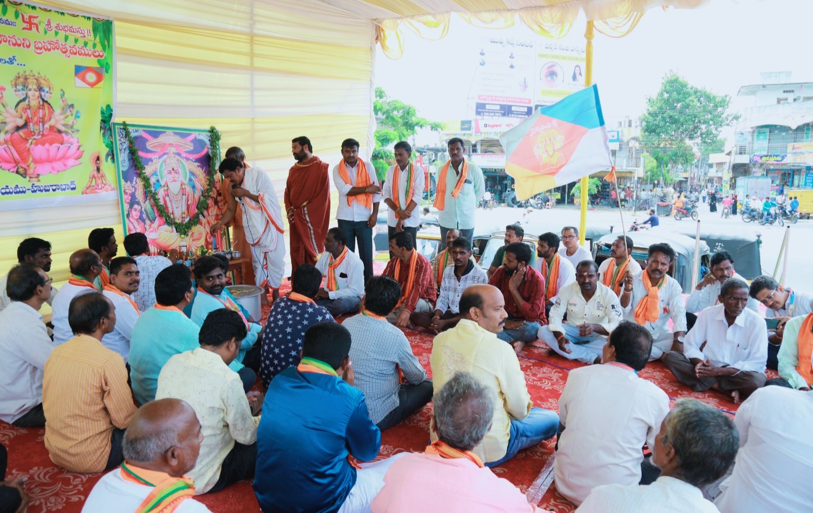మండల యాదగిరి, స్వర్ణోదయం ప్రతినిధి హుజురాబాద్: హుజురాబాద్ వీరబ్రహ్మేంద్ర స్వామి వారి దేవాలయంలో విరాట్ విశ్వకర్మ భగవానుని యజ్ణమహోత్సవం మంగళవారం కన్నుల పండుగ నిర్వహించారు. ఈ సంధర్బంగా స్వామి వారి పతాకావిష్కరణ గావించి, యజ్ణమహోత్సవం, హోమం జరిపి దేవాలయం నుండి అంబేడ్కర్ చౌరస్తా వరకు విశ్వకర్మలచే బైక్ ర్యాలీ నిర్వహించి స్వామి వారి పటం పూజ జరిపారు. ఈ కార్యక్రమంలో విశ్వకర్మలందరూ అధిక సంఖ్యలో పాల్గొని స్వామివారి తీర్థప్రసాదాలు స్వీకరించారు. ఈ కార్యక్రమాన్ని ఉద్దేశించి పండితులైన కోటగిరి ప్రవీణ్ కుమార్ శర్మ మాట్లాడుతూ ఈ సృష్టికి మూలం విశ్వకర్మ భగవానుడే నని అన్నారు.