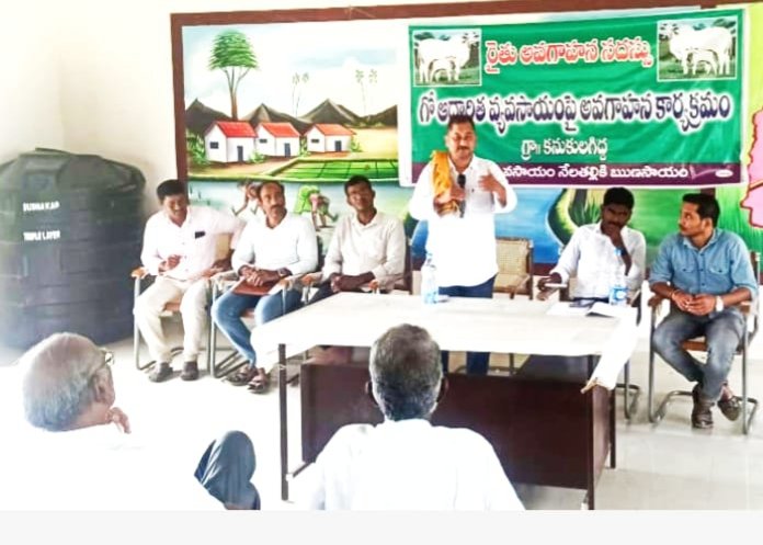 మండల యాదగిరి, స్వర్ణోదయం ప్రతినిధి హుజురాబాద్: కరీంనగర్ జిల్లా హుజూరాబాద్ మండలం కనుకులగిద్దె గ్రామంలో రైతు వేదిక కార్యాలయంలో రైతులకు గో ఆధారిత సేంద్రియ వ్యవసాయం పైన అవగాహన కార్యక్రమం నిర్వహించారు. ఈ కార్యక్రమంలో గో సంరక్షక్ సేవా సమితి ప్రతినిధి వుట్కూరి రాదాక్రిష్ణరెడ్డి హాజరై మాట్లాడుతూ గోవుల యొక్క విశిష్టత తెలియజేశారు. గోవు ఆధారిత వ్యవసాయం వల్ల గోవుల సంతతి పెరగటం తో పాటు నేల ఆరోగ్యం, పంట ఆరోగ్యాన్ని కాపాడుకోవచ్చని తెలిపారు. కార్యక్రమంలో గత కొన్ని సంవత్సరాలుగా సేంద్రియ వ్యవసాయం చేస్తున్న చొప్పదండి గ్రామ రైతు మల్లికార్జున్ రెడ్డి తన అనుభవ పూర్వకంగా రైతు సోదరులకు క్లుప్తంగా ఆయన అనుసరిస్తున్న పద్ధతుల గురించి తెలియజేశారు. తర్వాత సేంద్రియ వ్యవసాయంలో చేపట్టవలసిన యాజమాన్య పద్ధతుల గురించి హుజురాబాద్ మండల వ్యవసాయ అధికారి Ch.భూమిరెడ్డి, kvk సేద్య విభాగ శాస్త్రవేత్త విజయ్ తెలిపారు. కార్యక్రమంలో హుజురాబాద్ ఆత్మ చైర్మన్ కంకణాల రమేష్ రెడ్డి, హుజురాబాద్ Aeo నిఖిల్ కుమార్, రైతు సోదరులు పాల్గొన్నారు.